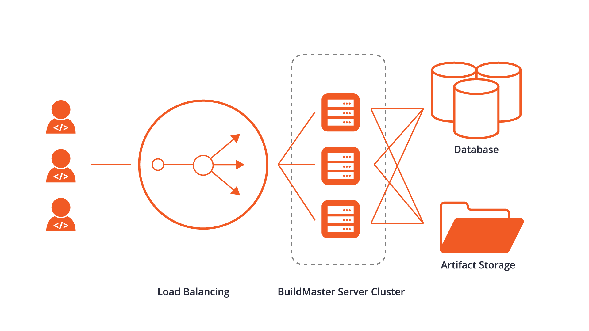 BuildMaster can be configured as a highly available, load-balanced server cluster, which means no single point of failure, and build/deployment executions can be evenly distributed across agents.