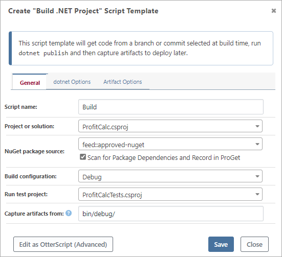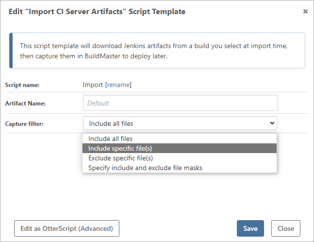 Use deploy script templates to deploy artifacts or packages created within BuildMaster or imported from a CI tool like Jenkins.