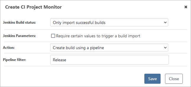 Configure a CI project monitor to detect new builds, then import artifacts for later deployment. Builds can be triggered based on a CI tool build status and build parameters.