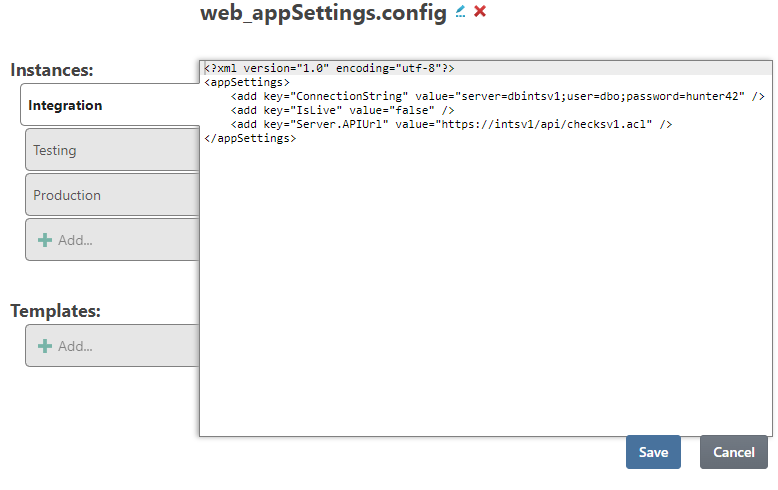 Store, secure, and deploy application configuration files like web.config, .properties, app.ini, etc. that contain environment-specific values and secrets.