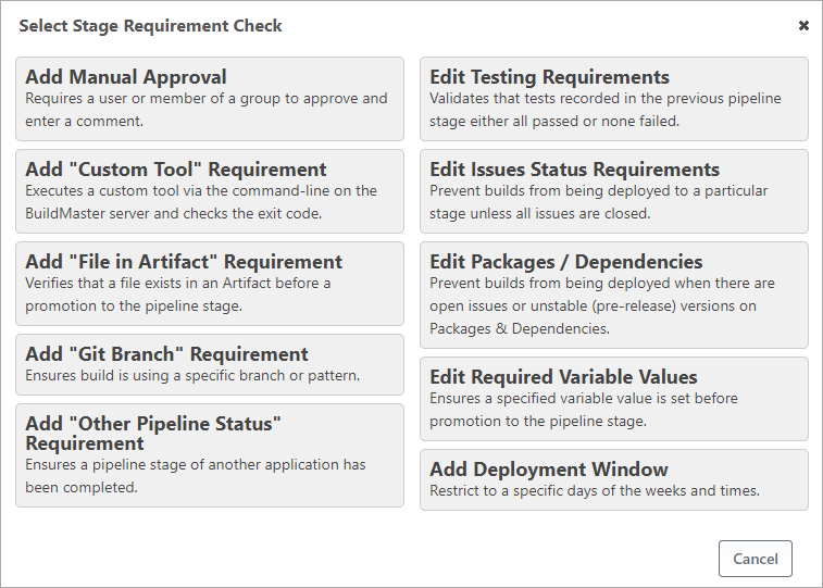 Define stage requirements including Manual Approval, Deployment Window, and Git Branch that will prevent deployment until the requirements are met.