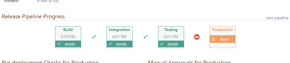 Deployment pipelines allow you to visualize the status of builds while creating a repeatable process with manual approvals, deployment windows, input (variable) prompts, and automated checks. You can also choose between automatic or manual promotion to the next stage.
