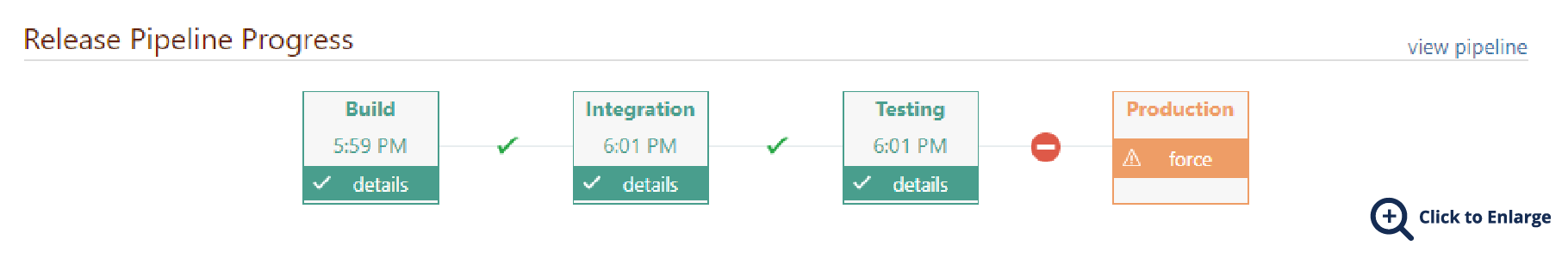 BuildMaster’s deployment pipelines allow you to visualize the status of builds while creating a repeatable process with manual approvals, deployment windows, input (variable) prompts, and automated checks. You can also choose between automatic or manual promotion to the next stage.