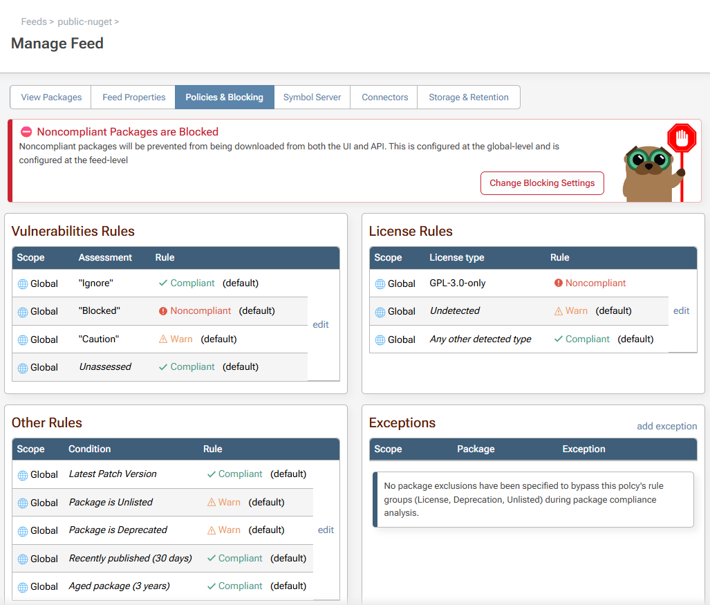 ProGet offers a more flexible governance model: it still enforces rules, but it also supports human review, contextual overrides, and automated recommendations instead of forcing a binary decision. It’s purpose-built to help organizations address OSS vulnerabilities in a more practical and adaptable way.
